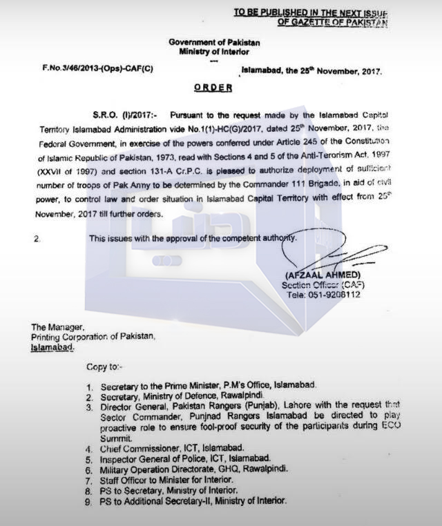 - حکومت نے اسلام آباد میں قیام امن کیلئے فوج طلب کر لی، وزارت داخلہ نے فوج کی طلبی کا نوٹیفکیشن جاری کر دیا۔