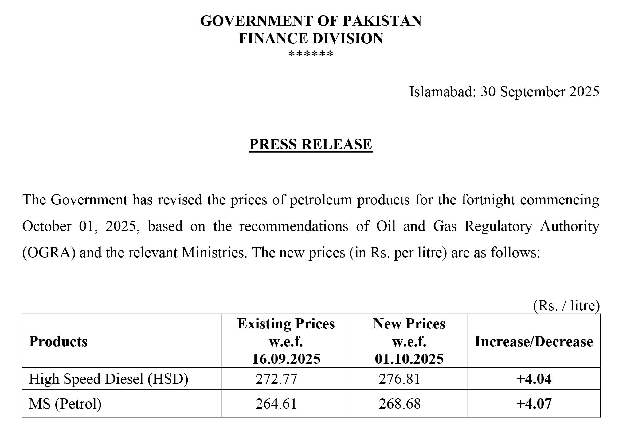 اِسی طرح ہائی سپیڈ ڈیزل 4 روپے 4 پیسے بڑھ گیا، نئی قیمت 272 روپے 77 پیسے سے بڑھ کر 276 روپے 81 پیسے مقرر کی گئی ہے۔