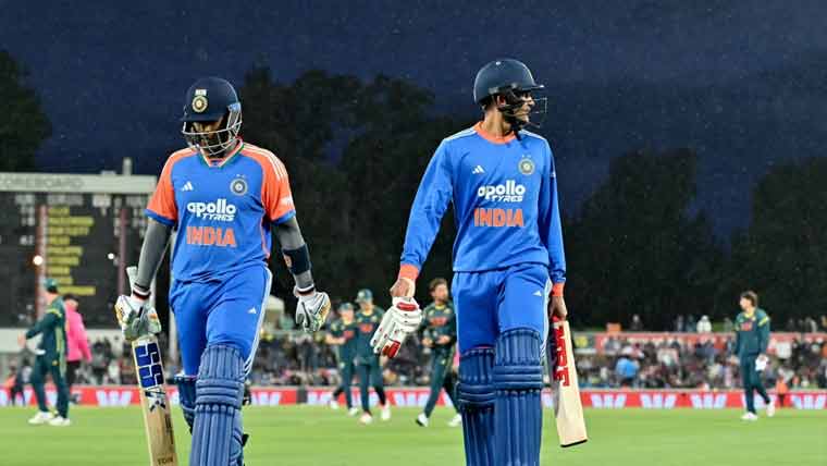 جب دوسری مرتبہ کھیل رکا تو بھارت نے ایک وکٹ کے نقصان پر 97 رنز بنا لیے تھے، اس وقت سوریا کمار یادیو 39 رنز اور شبمان گل 37 رنز بنا کر کریز پر موجود تھے۔