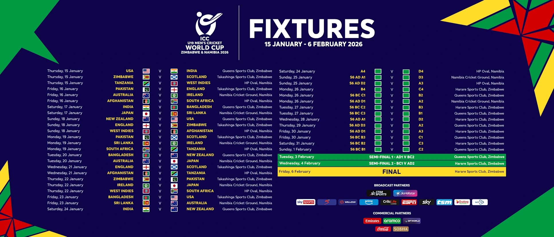 شیڈول کے مطابق میگا ایونٹ 15 جنوری سے 6 فروری تک زمبابوے اور نمیبیا میں کھیلا جائے گا۔