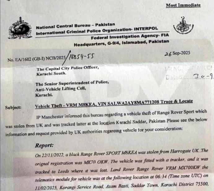 انٹرپول نے سندھ پولیس کو قیمتی کار برآمدگی میں مدد کیلئے خط لکھ دیا، کالی رینج روور 22 نومبر 2022ء کو ہیرو گیٹ سے چوری کی گئی تھی، گاڑی کو ٹریک کرنے پر لوکیشن کراچی صدر کی آئی ہے۔