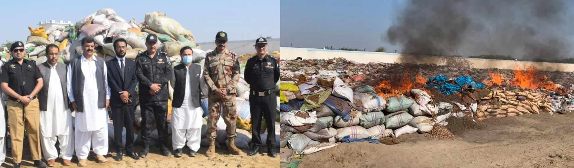 تلف شدہ سامان میں چھے سو چودہ میٹرک ٹن چھالیہ اور آٹھ سو میٹرک ٹن گٹکا اور سپاری شامل تھی، 21 ہزار 261 پیکٹ غیر ملکی سگریٹس اور 21 میٹرک ٹن چائنا نمک بھی تلف کیا گیا۔