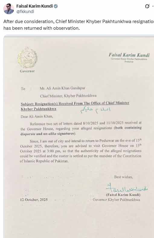 گورنر خیبرپختونخوا فیصل کریم کنڈی نے وزیراعلیٰ کے دستخط پر اعتراض لگا کر استعفیٰ واپس کیا ہے، گورنر خیبرپختونخوا فیصل کنڈی کی جانب سے لکھے گئے خط میں علی امین گنڈا پور کے دونوں استعفوں پر دستخط کو مختلف اور غیرمشابہ قرار دیا گیا۔
