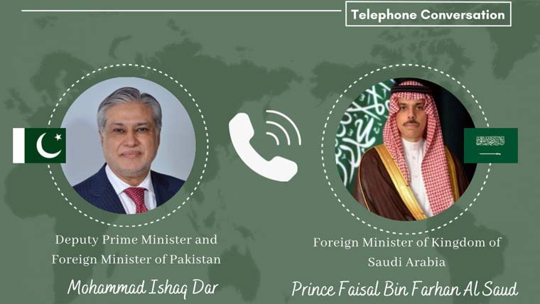 وزارت امور خارجہ کے ایکس اکاؤنٹ پر کی گئی پوسٹ کے مطابق نائب وز یراعظم و وزیرخارجہ اسحاق ڈار کو سعودی عرب کے وزیرخارجہ شہزادہ فیصل بن فرحان کی ٹیلی فونک کال موصول ہوئی۔