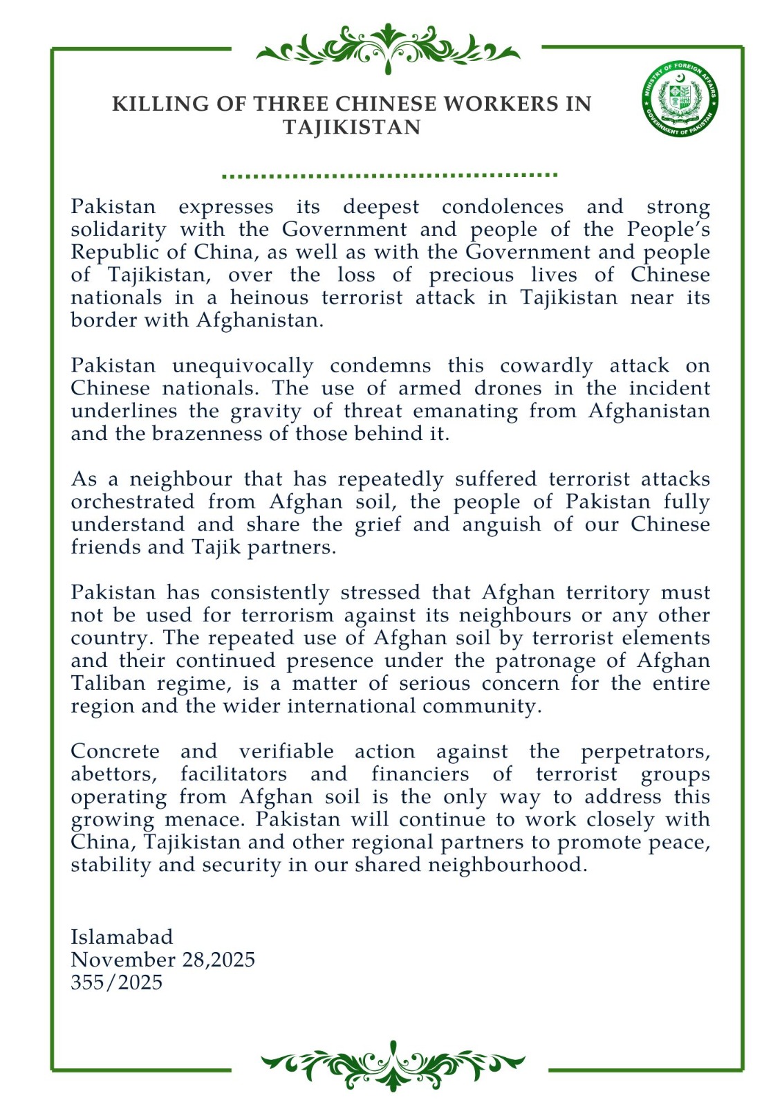 وزارت خارجہ سے جاری بیان میں کہا گیا ہے کہ پاکستان نے مسلسل اس بات پر زور دیا ہے کہ افغان سرزمین اپنے پڑوسیوں یا کسی دوسرے ملک کے خلاف دہشت گردی کے لیے استعمال نہیں ہونی چاہئے۔