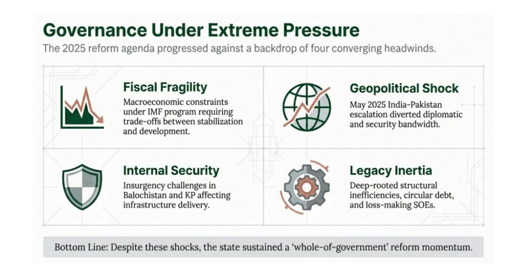 رپورٹ کے مطابق2025 میں 135 سے زائد وفاقی اداروں میں 600 اصلاحاتی اقدامات کیے گئے۔ادارہ جاتی سطح پر اصلاحات کا مقصد وقتی فیصلوں کے بجائے دیر پا نظام کا قیام واضح رہا جبکہ پاکستان ڈیجیٹل نیشن ایکٹ 2025 کے نفاذ سے ڈیجیٹل معیشت کے لیے قومی فریم ورک قائم کیا گیا،ڈیجیٹل گورننس کے لیے پاکستان ڈیجیٹل اتھارٹی اور نیشنل ڈیجیٹل کمیشن قائم کیے گئے،الیکٹرانک جرائم ترمیمی ایکٹ 2025 کے ذریعے آن لائن تحفظ اور ڈیجیٹل احتساب مضبوط بنایا گیا۔