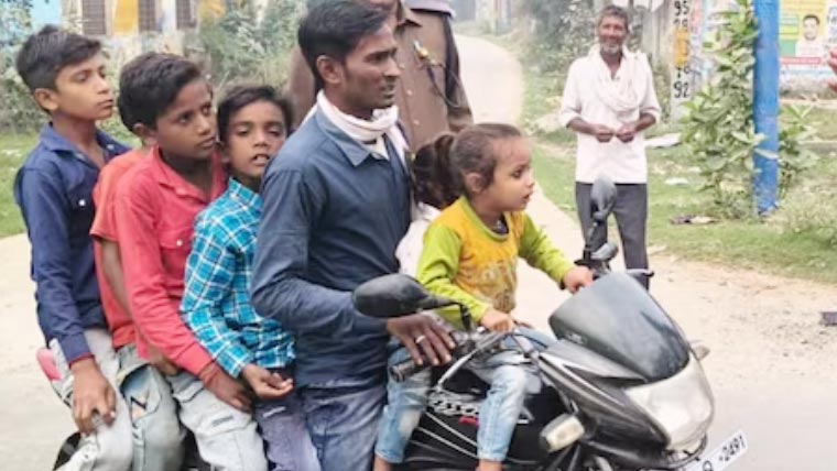 بھارتی میڈیا رپورٹ کے مطابق بھارت کی ریاست اترپردیش کے ضلع ہاپوڑ کے علاقے گڑھ مکتیشور میں ٹریفک پولیس معمول کی چیکنگ کر رہی تھی کہ ایک شخص کو 6 بچوں کو موٹر سائیکل پر لے جاتا دیکھ کر ٹریفک پولیس اہلکار دنگ رہ گئے اور اس سے ہاتھ جوڑ کر 7 ہزار روپے کا چالان کر دیا۔