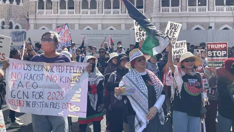 عوام نے اپنی طاقت کا اظہار کرتے ہوئے ریلی میں غزہ کو آزاد کرو کے نعرے بلند کیے، فلسطینی حامی مظاہرین نے صدر ٹرمپ کے دورے کی سخت مخالفت کی، کوالالمپور میں احتجاجی مظاہرہ امن و محبت کے پیغام کے ساتھ جاری رہا۔